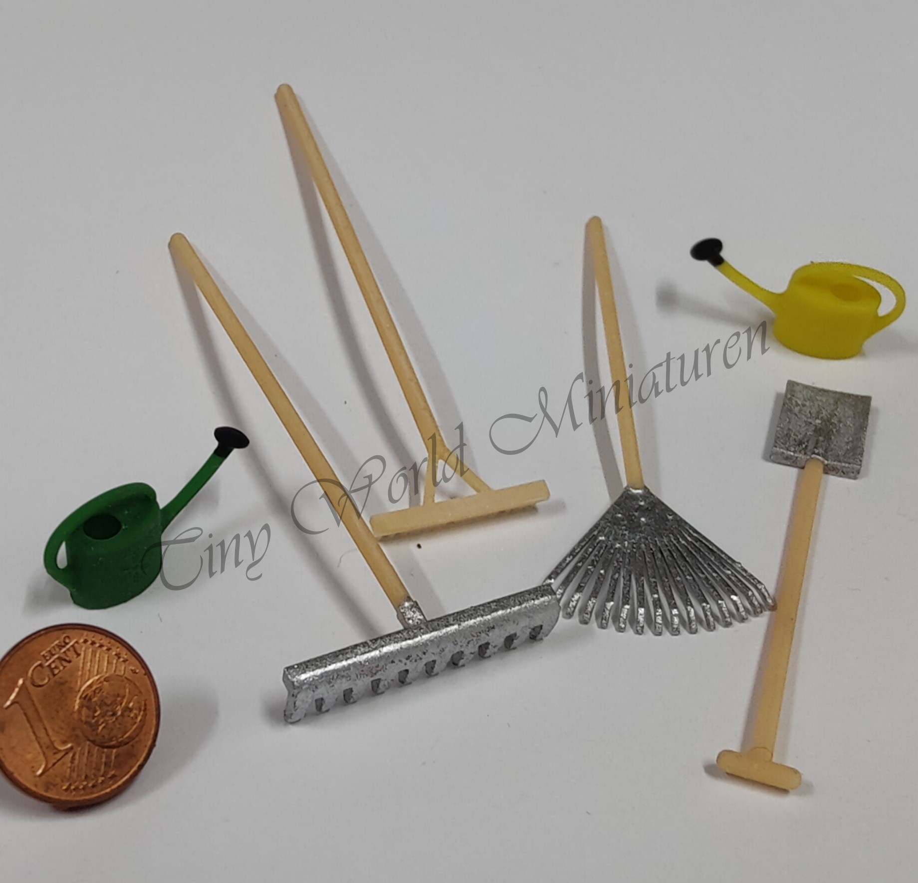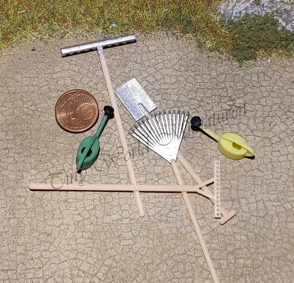 Das Set besteht aus 2 Gießkannen, jeweils gelb und grün (Maße am Boden ca. 11,5 x 7 mm, Höhe ca. 13 mm), einem Holzrechen, einem Spaten, einem Laubrechen und einer Harke (Länge der Geräte zwischen 65 und 70 mm).