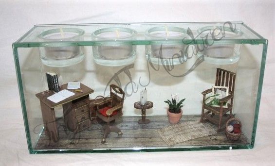 Ein Glas mit Aufsatz für 4 Teelichter. Dekoriert mit kleiner Arbeitszimmer-Szene inkl. Möbeln aus Holz. Die gesamte Dekoration ist handgefertigt.