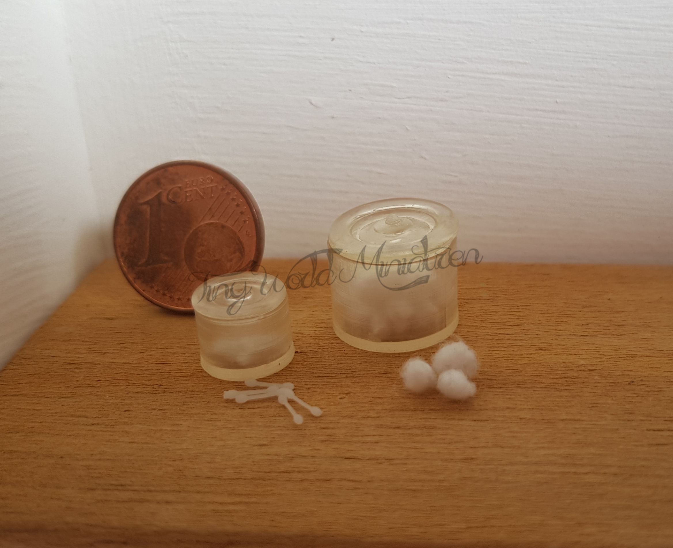 Das Set besteht aus einem großen Glas mit Deckel (ca. 1 cm hoch, 1,3 cm Dm.), gefüllt mit Wattebällchen und einem kleinen Glas mit Deckel (ca. 0,7 cm hoch, 0,8 cm Dm.), gefüllt mit 15 Wattestäbchen.
