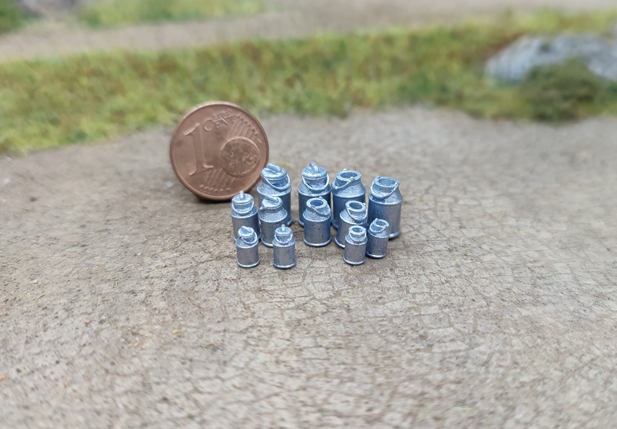 Das Set besteht aus 12 Milchkannen in 3 verschiedenen Größen (ca. 8,5x5 mm, 7x4 mm und 5x3 mm - ohne Deckel).