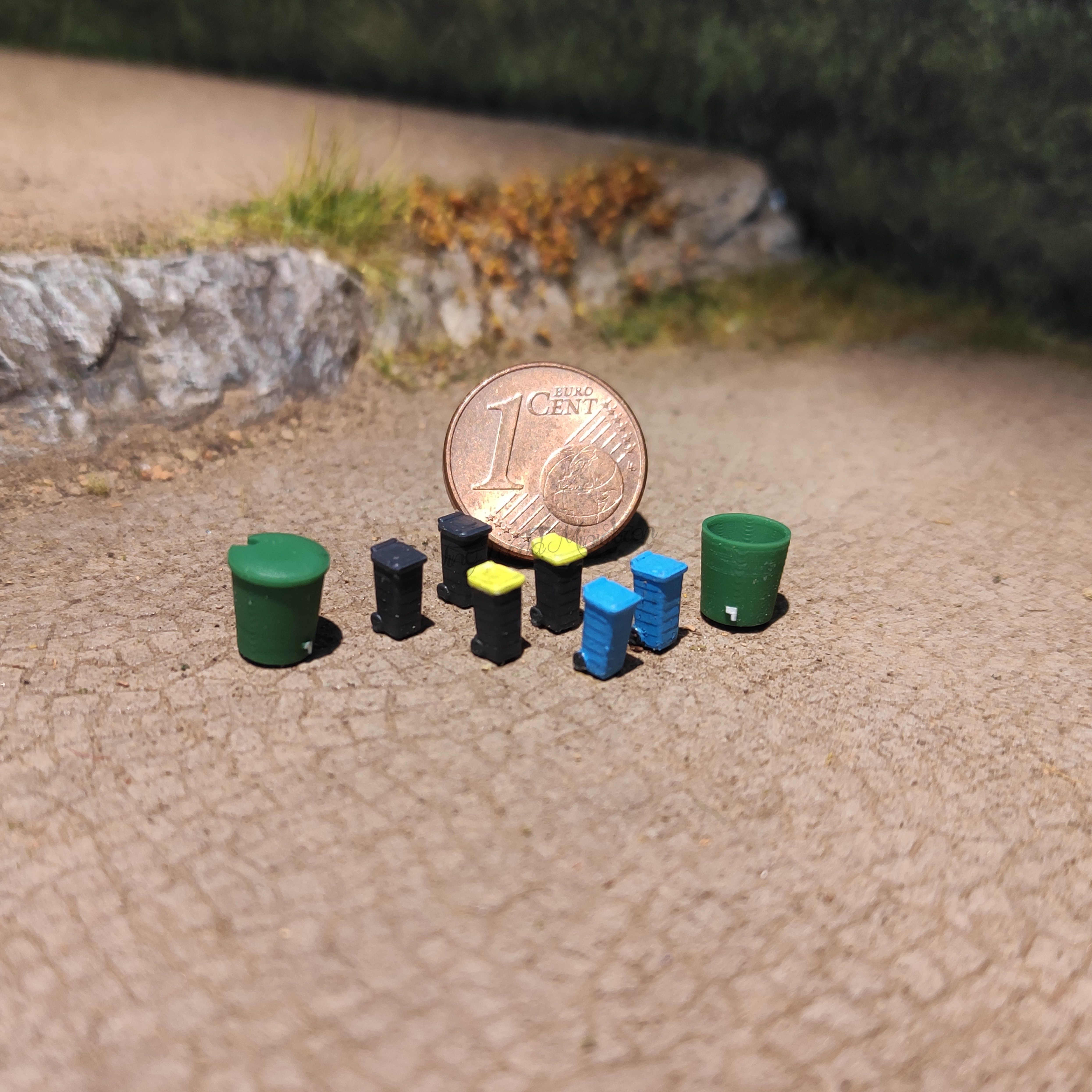Das Set besteht aus 2 schwarzen Restmülltonnen, 2 blauen Papiertonnen, 2 schwarz/gelben Plastabfalltonnen, einem Regenfass ohne Deckel und einem Regenfass mit Deckel (Referenzmaß Höhe ca. 8 mm, Durchmesser oberer Rand ca. 7 mm).