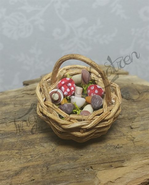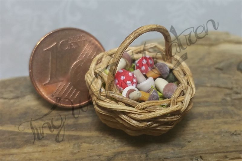 Das Set besteht aus einem kleinen Spankörbchen (Durchmesser ca. 2 cm, Höhe mit Henkel ca. 2,4 cm) gefüllt mit verschiedenen Pilzsorten auf Moos.