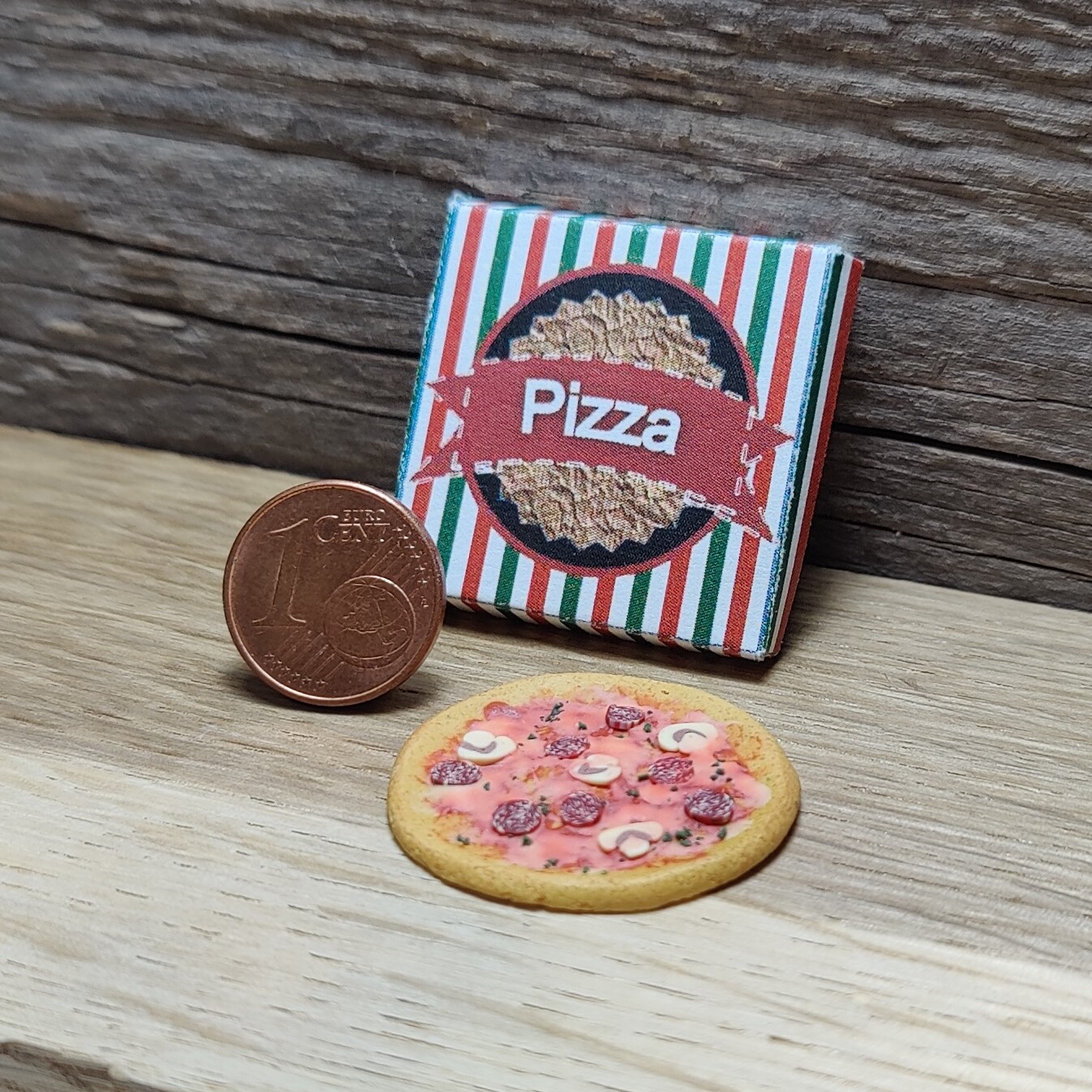 Eine Pizza "Salami" (Dm. ca. 2,5 cm) belegt mit Tomatensoße, Salami, Paprika und Käse im selbstgefertigten Pizzakarton (3 x 3 cm).