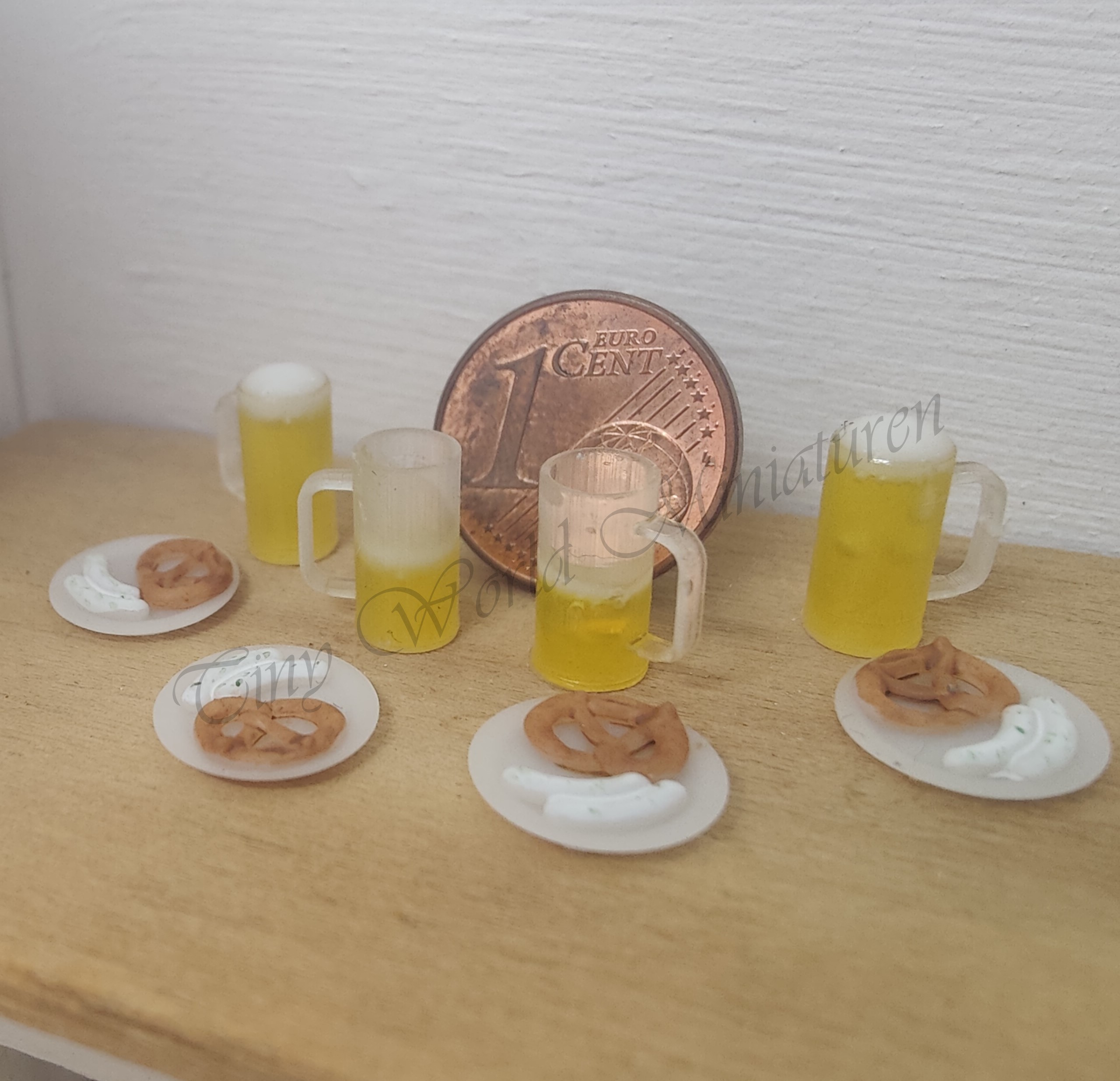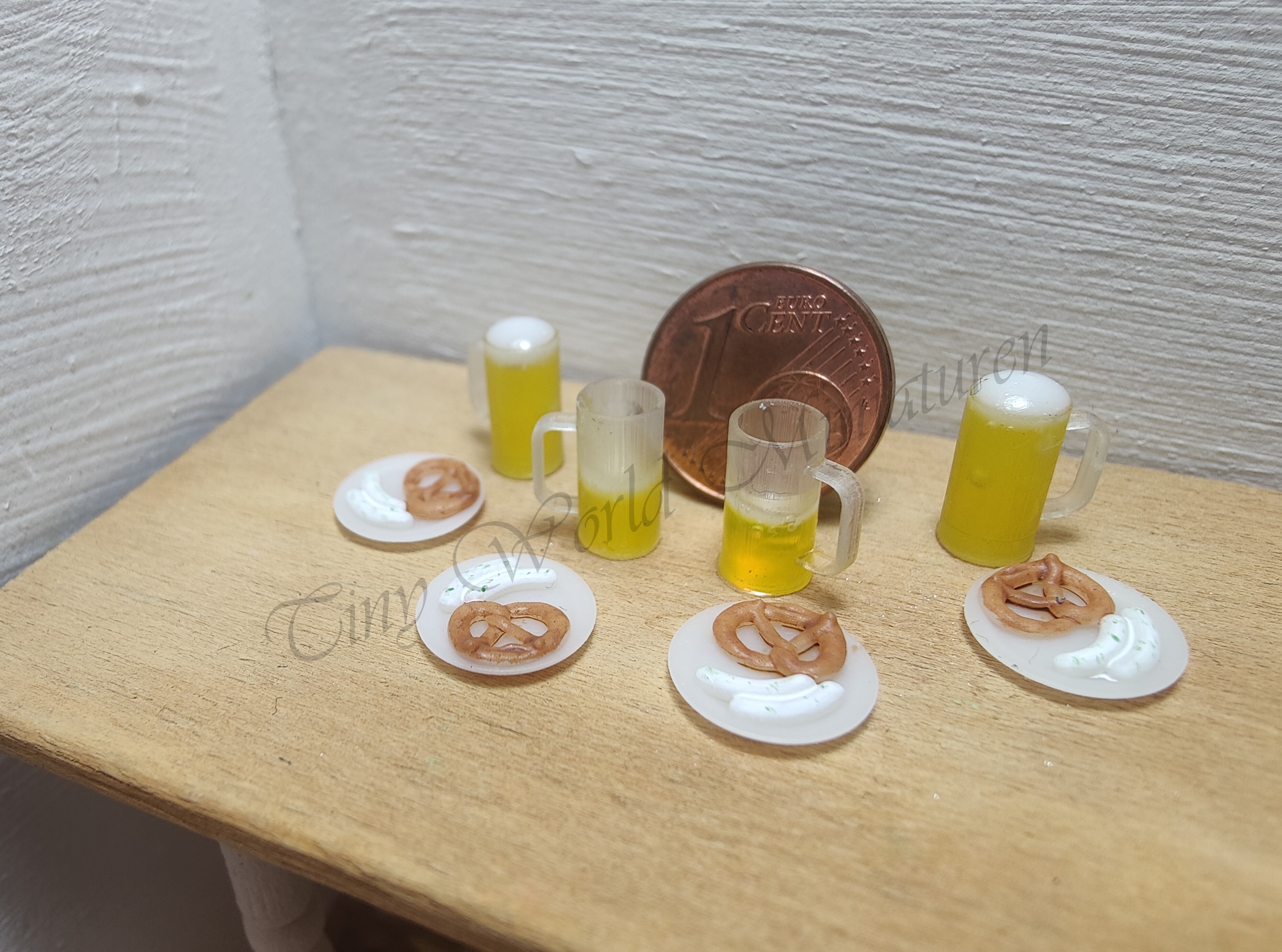 Das Set besteht aus 4 Tellern (Dm. ca. 1 cm) mit jeweils 2 Weißwürsten und einer Brezel, 2 gefüllten Biergläsern und 2 halbvollen Biergläsern.