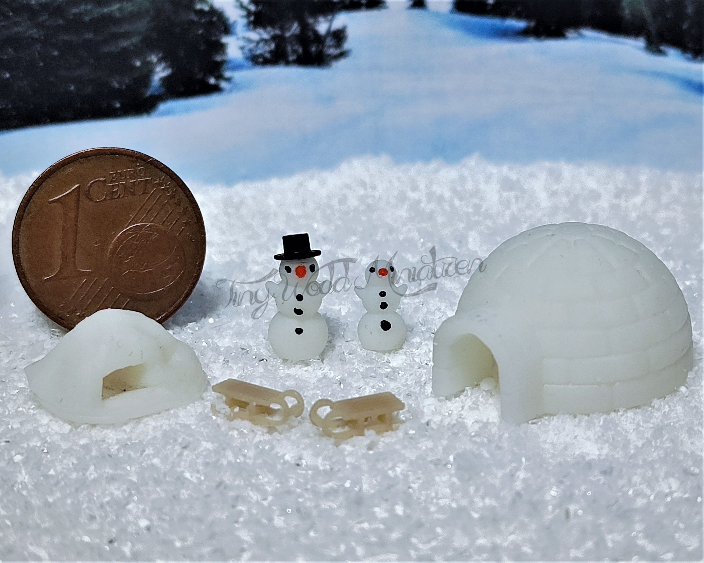 Das Set besteht aus einem Iglu (Referenzmaße ca. 2,0 x 1,2 cm), einer Schneehöhle, einem Schneemann mit Hut, einem Schneemann ohne Hut und 2 Schlitten.