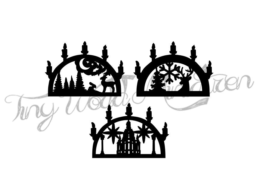 Im Set befinden sich jeweils ein schwarzer und ein hellbrauner Schwibbogen je Größe und mit 3 verschiedenen Motiven.