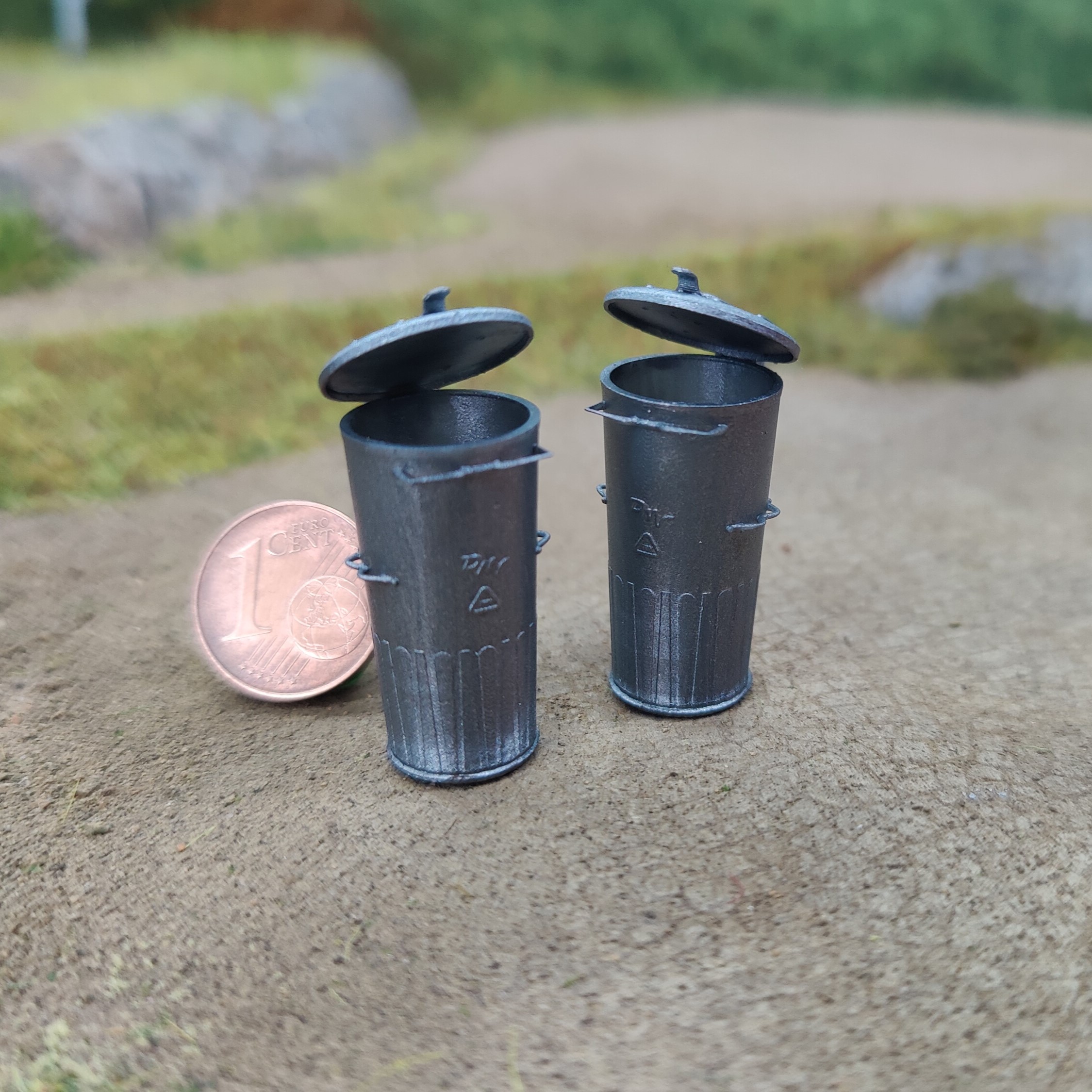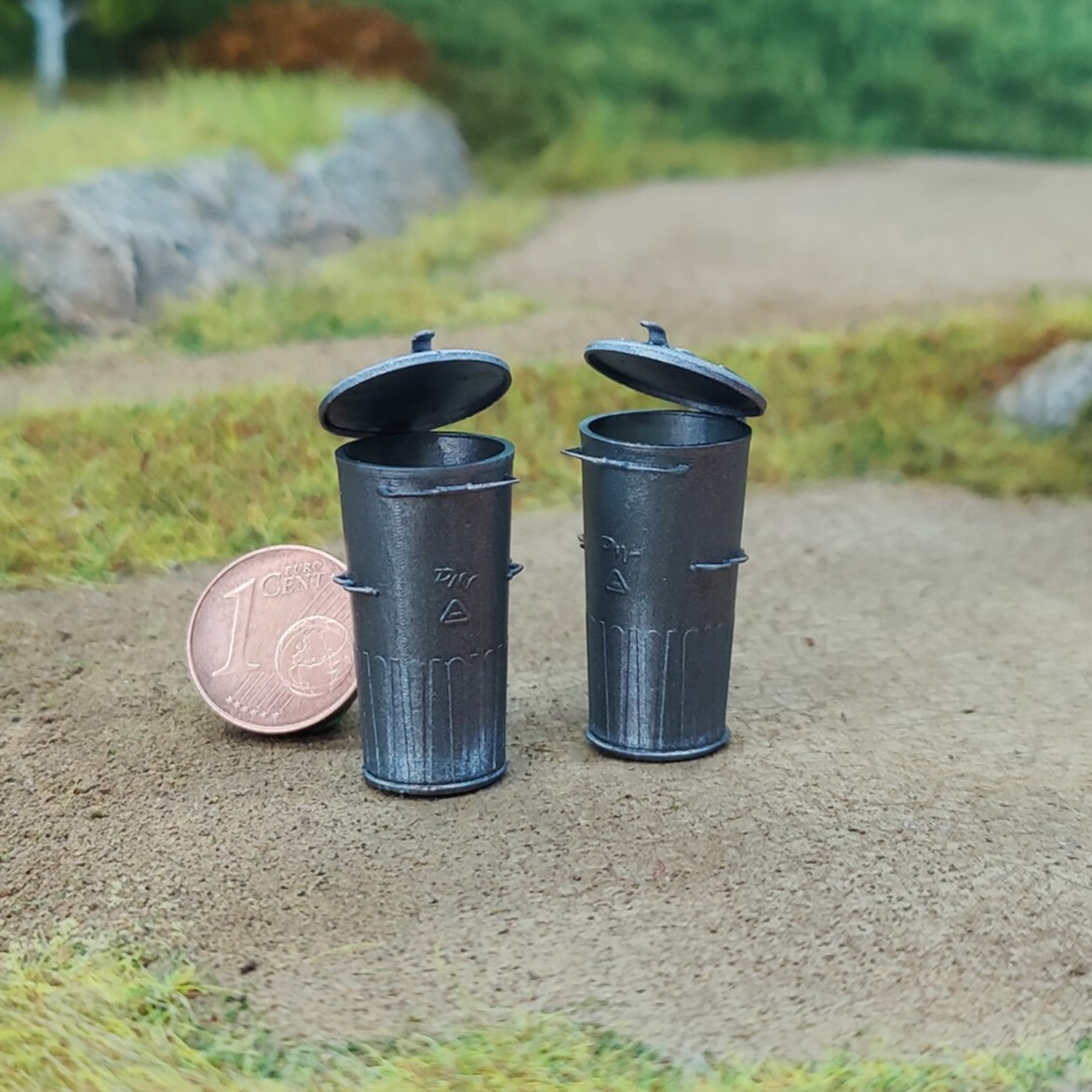 Das Set enthält 2 Mülltonnen im DDR-Stil. Der Deckel ist leicht geöffnet (nicht beweglich!), die Mülltonnen können befüllt werden.