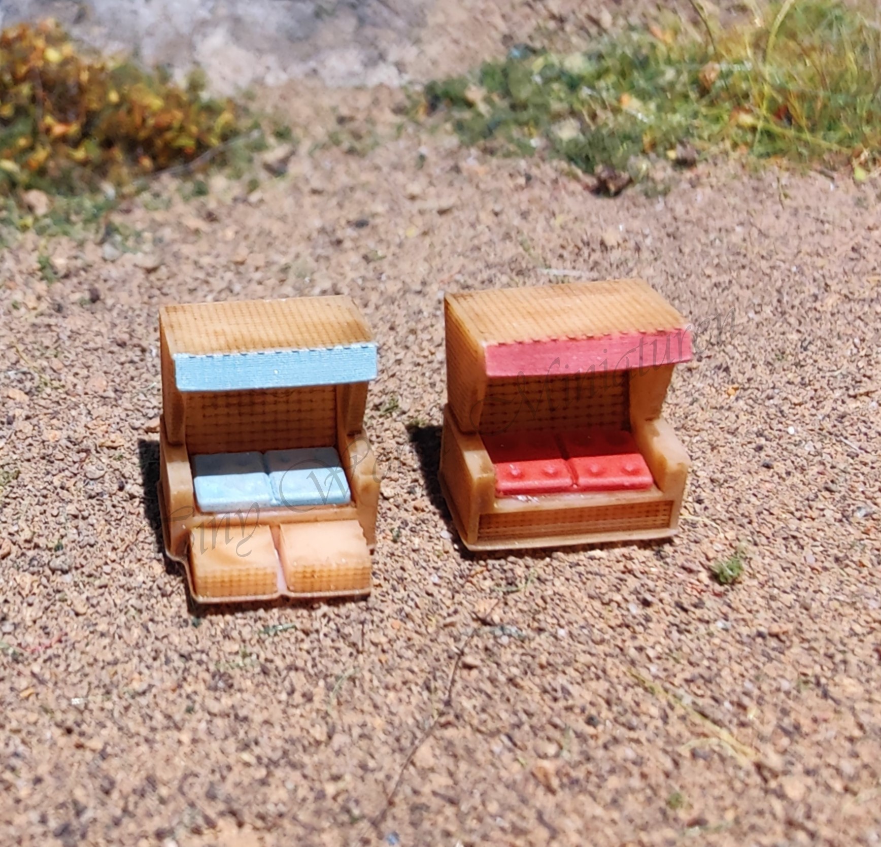 2 verschiedene Strandkörbe mit Sitzkissen, Maße L/B/H: ca. 7 x 4,5 x 7 mm (Korb ohne Fußteil)