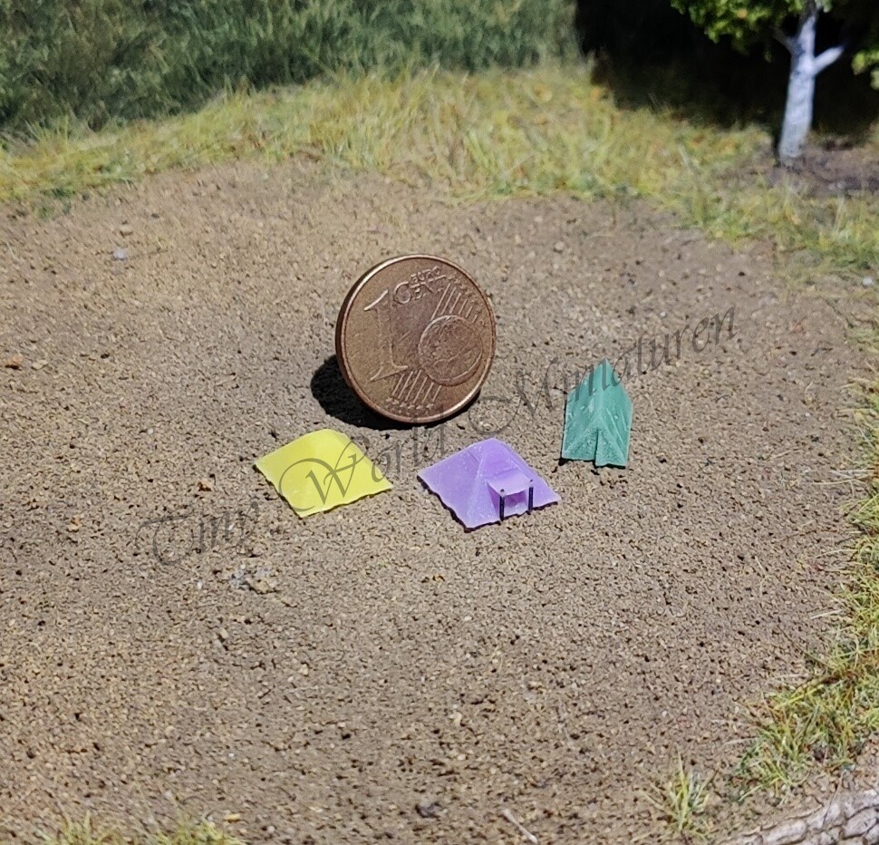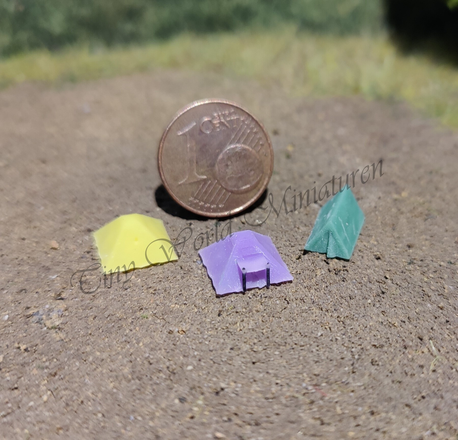 Das Set besteht aus einem dreieckigen Zelt (ca. 11 x 7 x 5 mm), zwei viereckigen Zelten, davon eins mit Vordach (beide ca. 10 x 10 x 5 mm).