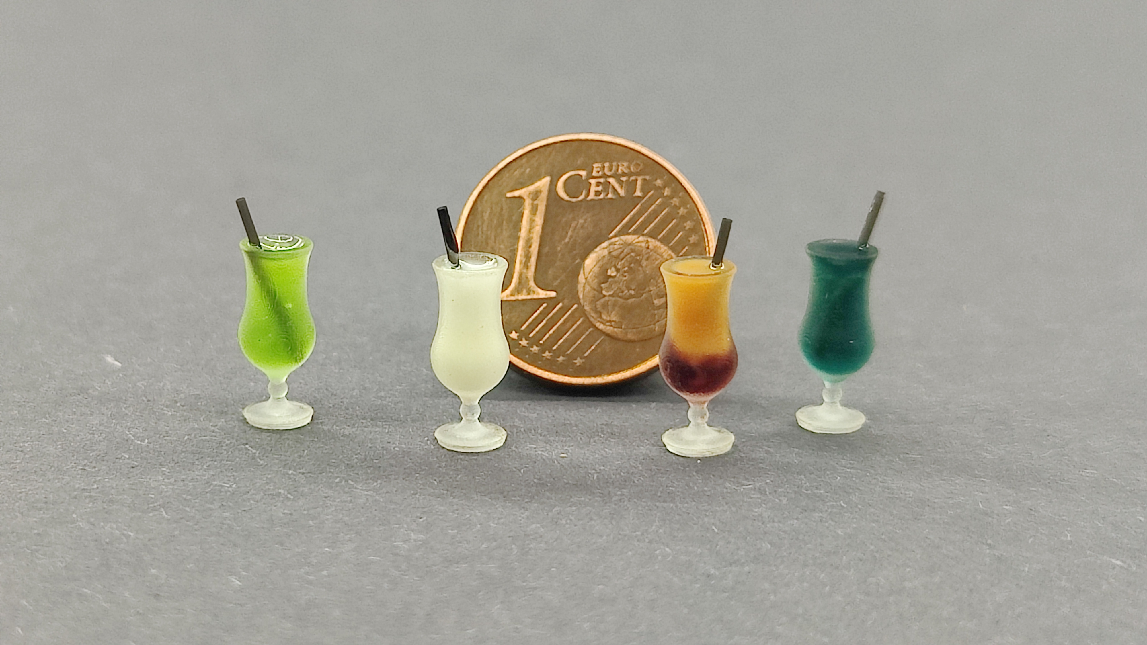 4 verschiedene Cocktails mit Trinkröhrchen (ca. 11 x 4,5 mm) zur Ausgestaltung Ihrer Gartenbahn.