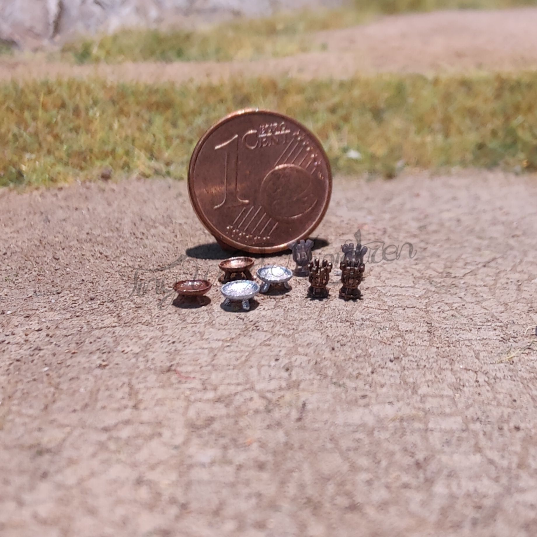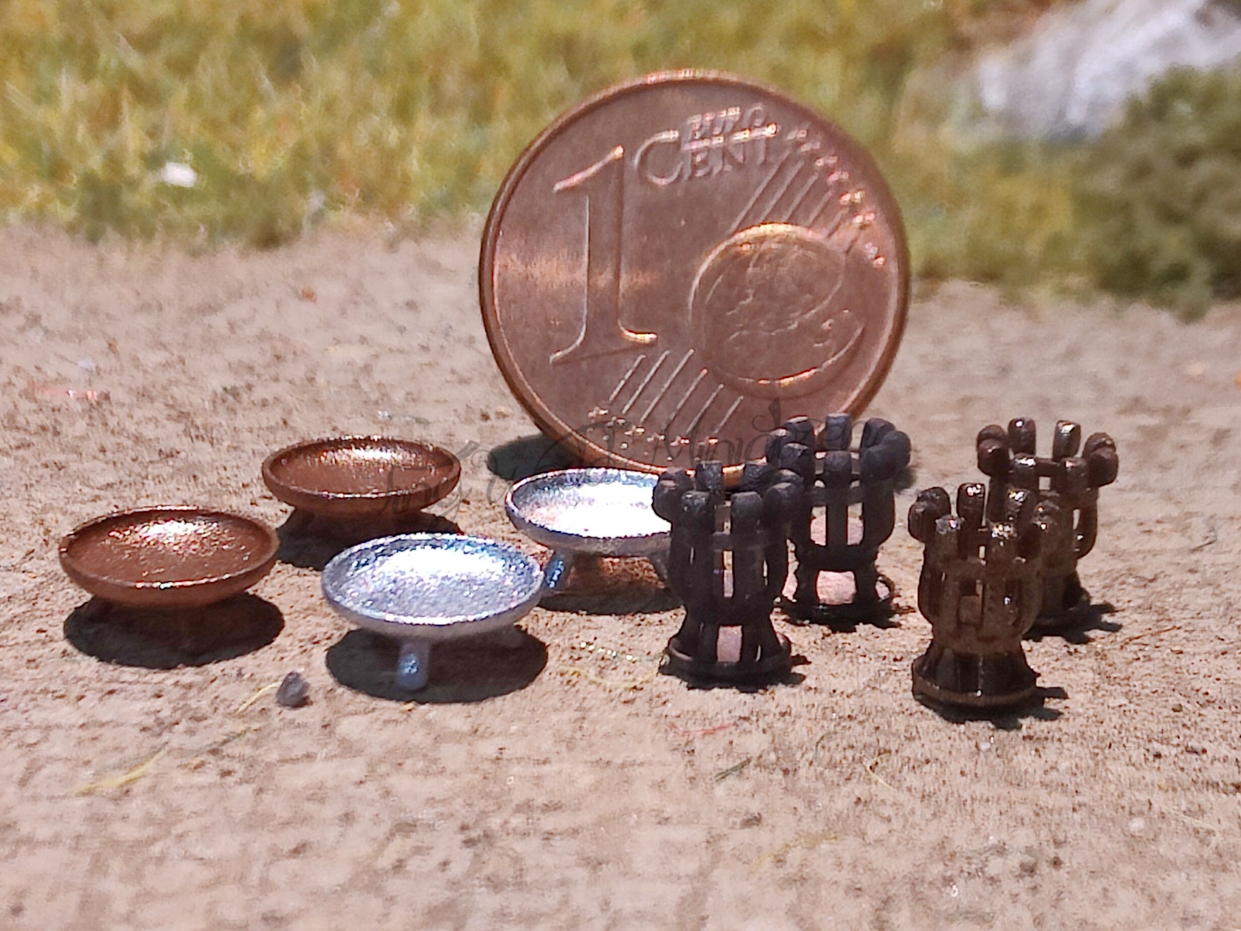 Das Set enthält 4 Feuerschalen (2x silber und 2x rostfarben - Maße ca. 3,5 x 2 mm) und 4 Feuerkörbe (2x schwarz und 2x rostfarben - Maße ca. 3,5 x 2,5 mm) zur Ausgestaltung Ihrer Modellbahn.