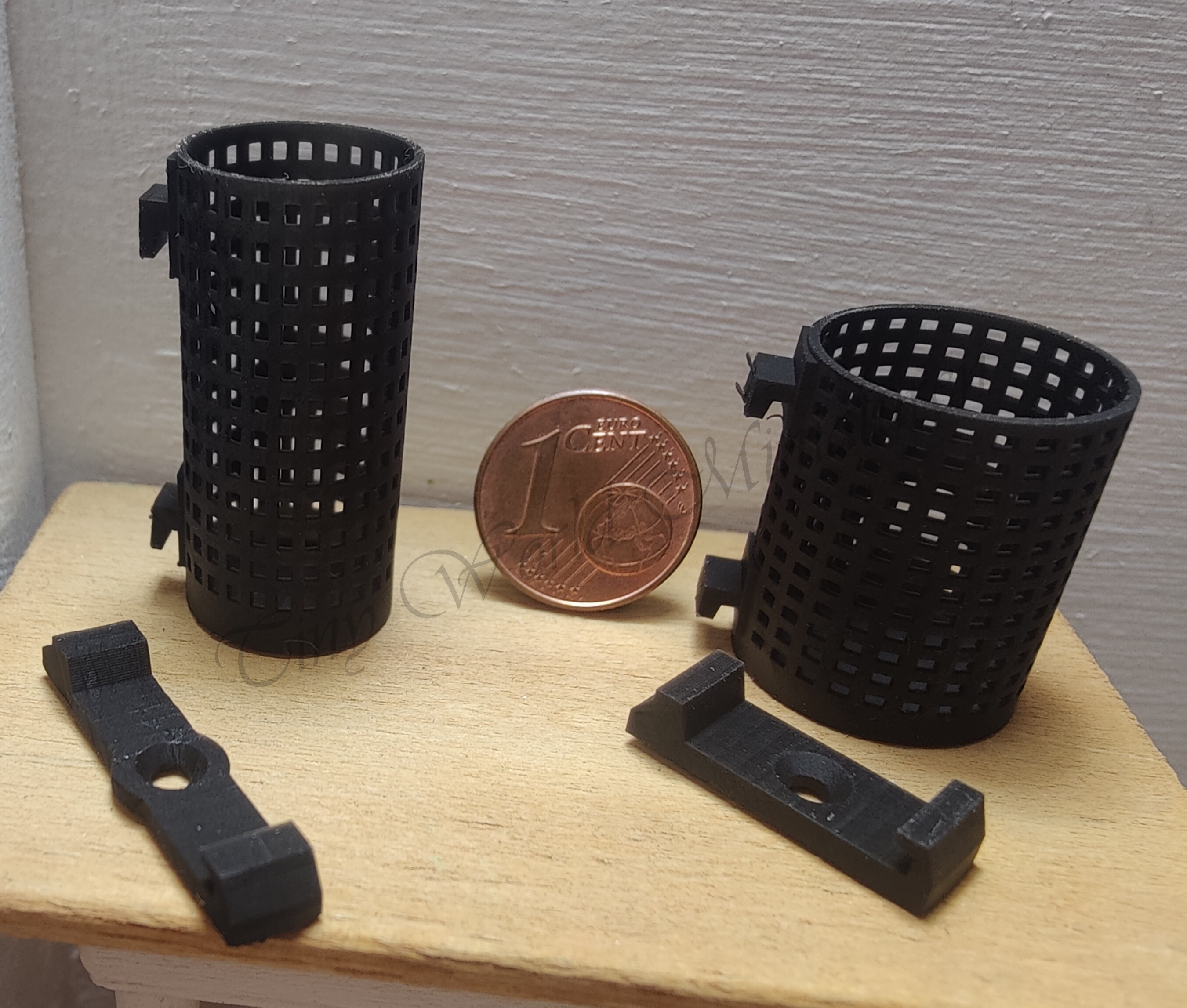 2 Mülleimer, jeweils mit Vorrichtungen zum Aufhängen oder Stecken (Maße ca. 3,3 x 1,55 cm und 2,3 x 1,85 cm) zur Gestaltung Ihrer Gartenbahn.