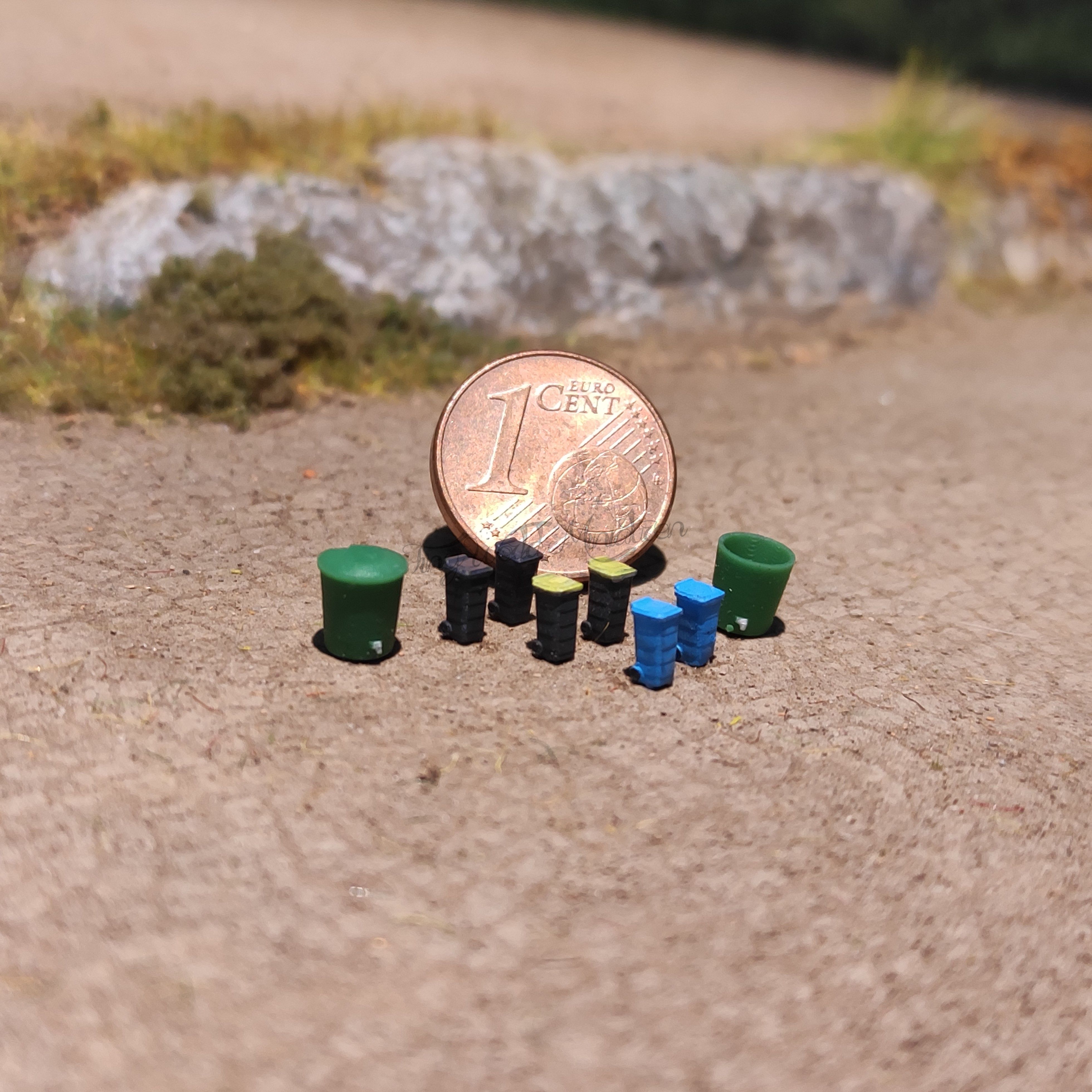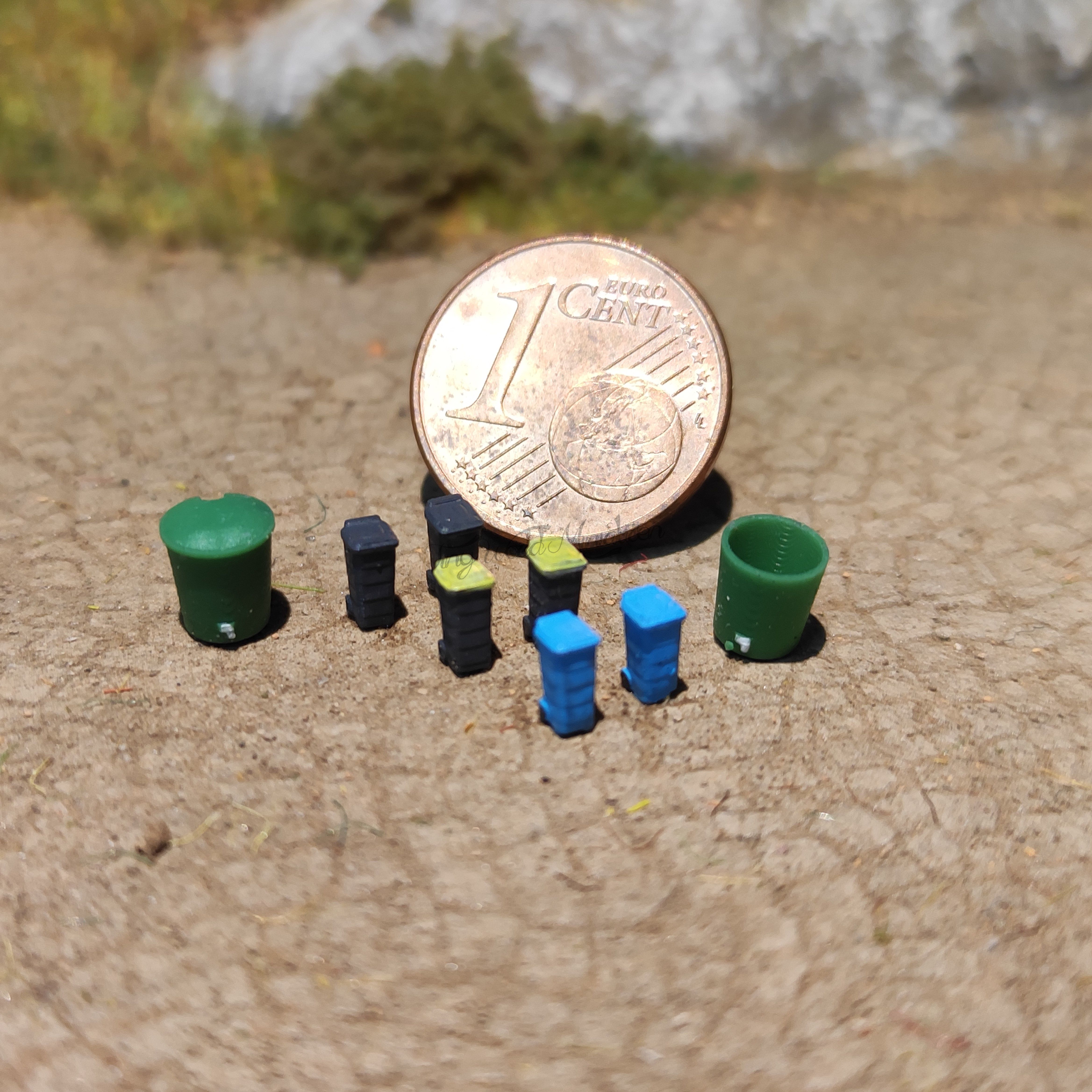 Das Set besteht aus 2 schwarzen Restmülltonnen, 2 blauen Papiertonnen, 2 schwarz/gelben Plastabfalltonnen, einem Regenfass ohne Deckel und einem Regenfass mit Deckel (Referenzmaß Höhe ca. 6 mm, Durchmesser oberer Rand ca. 5 mm).