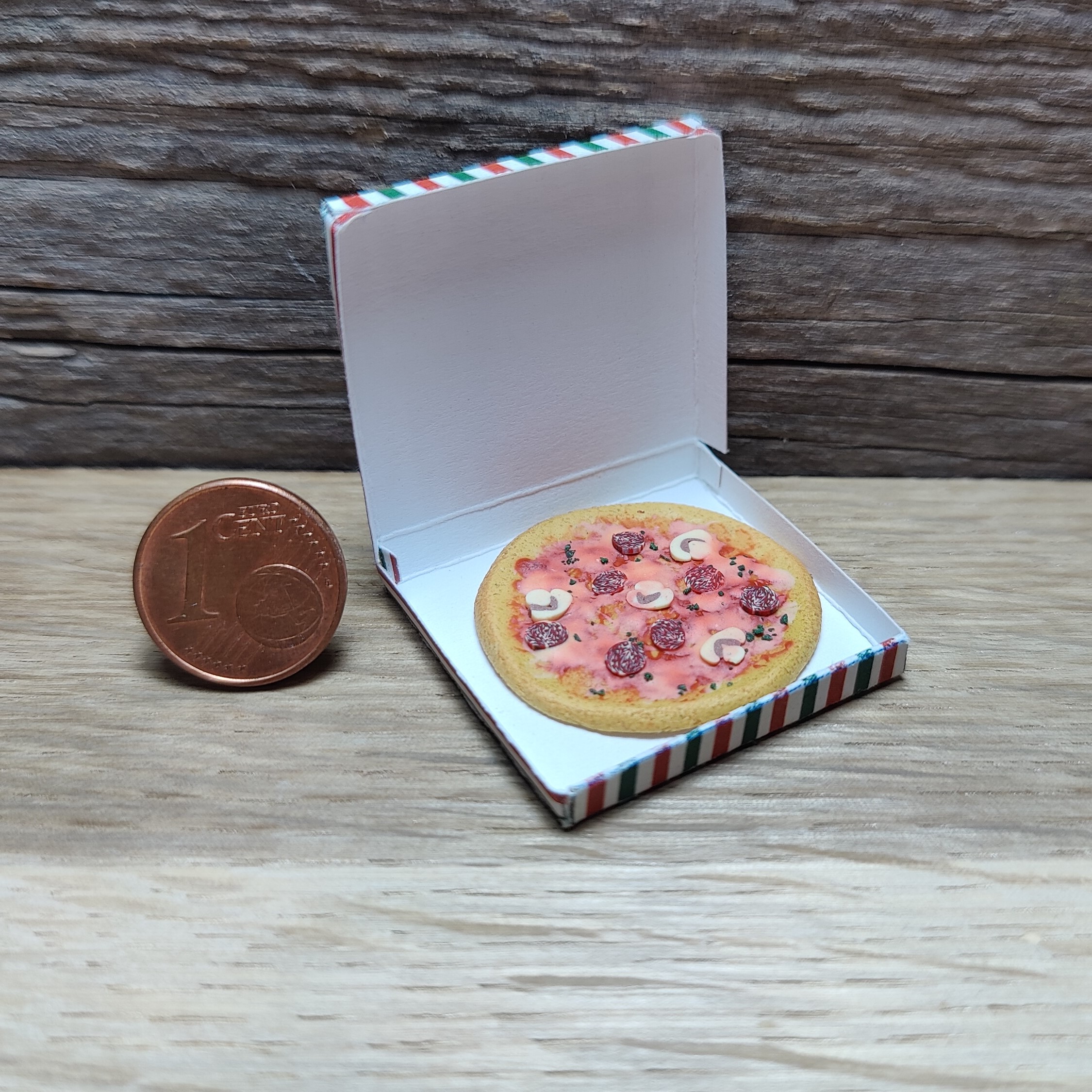 Eine Pizza "Salami" (Dm. ca. 2,5 cm) belegt mit Tomatensoße, Salami, Paprika und Käse im selbstgefertigten Pizzakarton (3 x 3 cm).