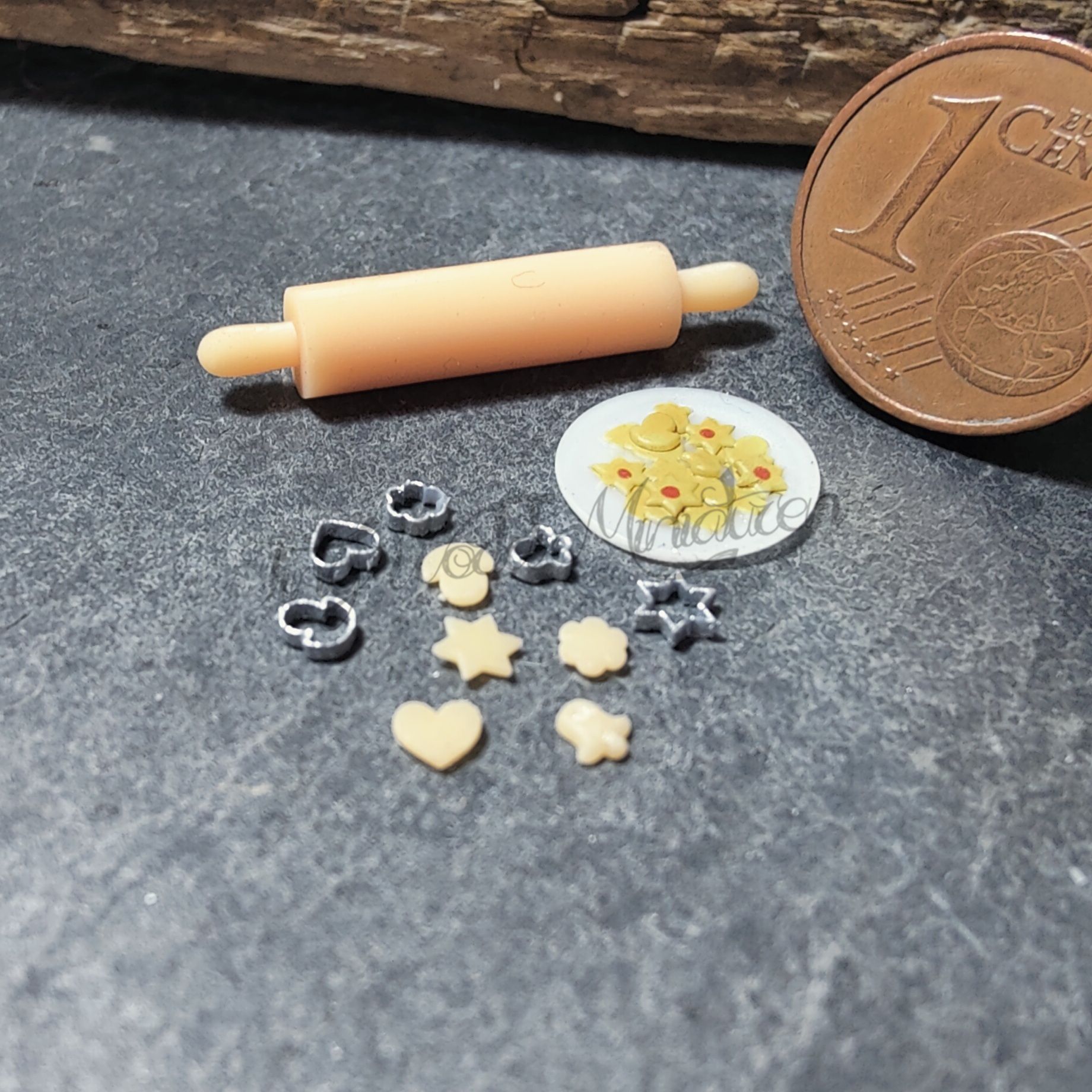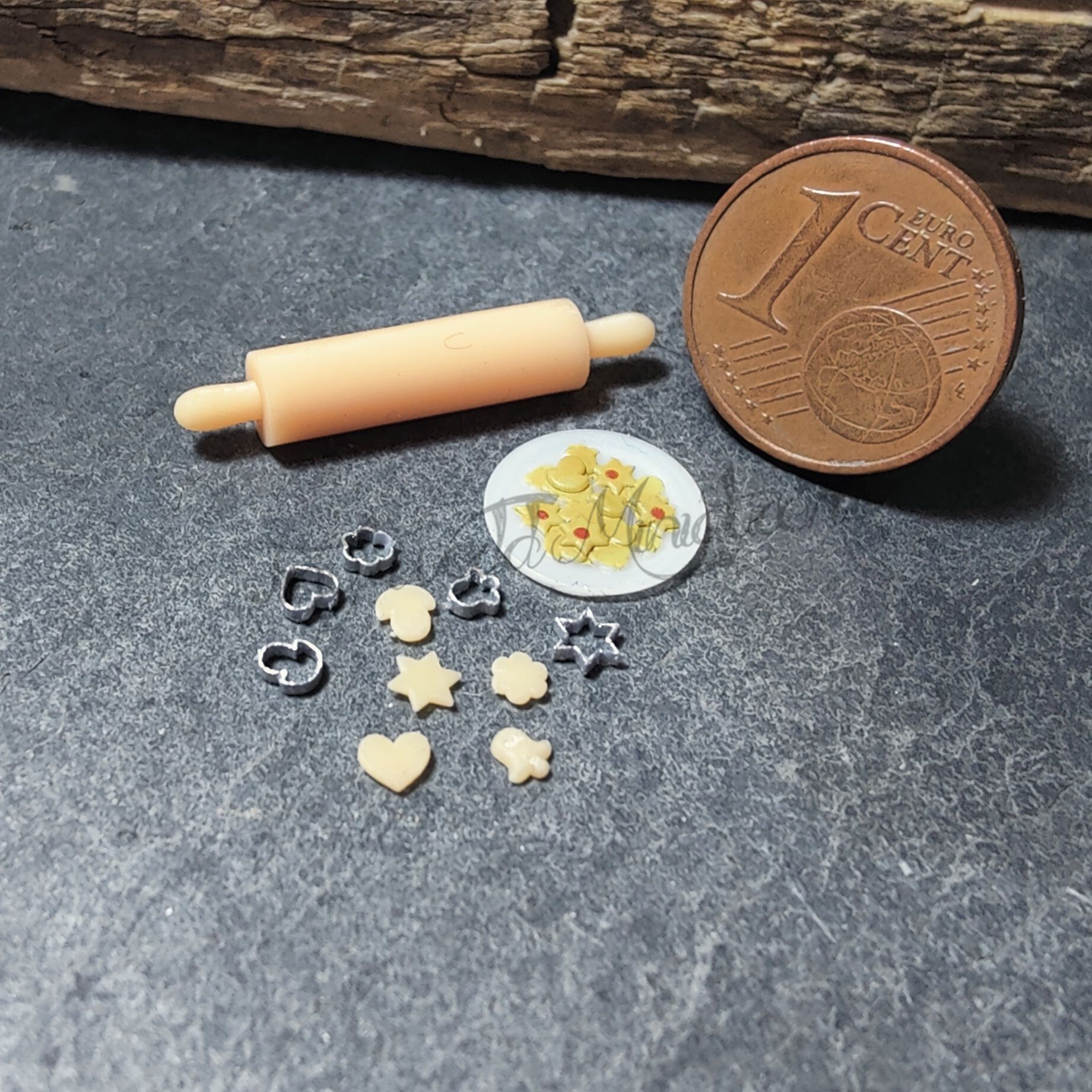 Das Set besteht aus einem Teller mit Plätzchen (Referenzmaß Durchmesser ca. 1,1 cm), einem Nudelholz, 5 ausgestochenen Plätzchen und 5 Ausstechförmchen.