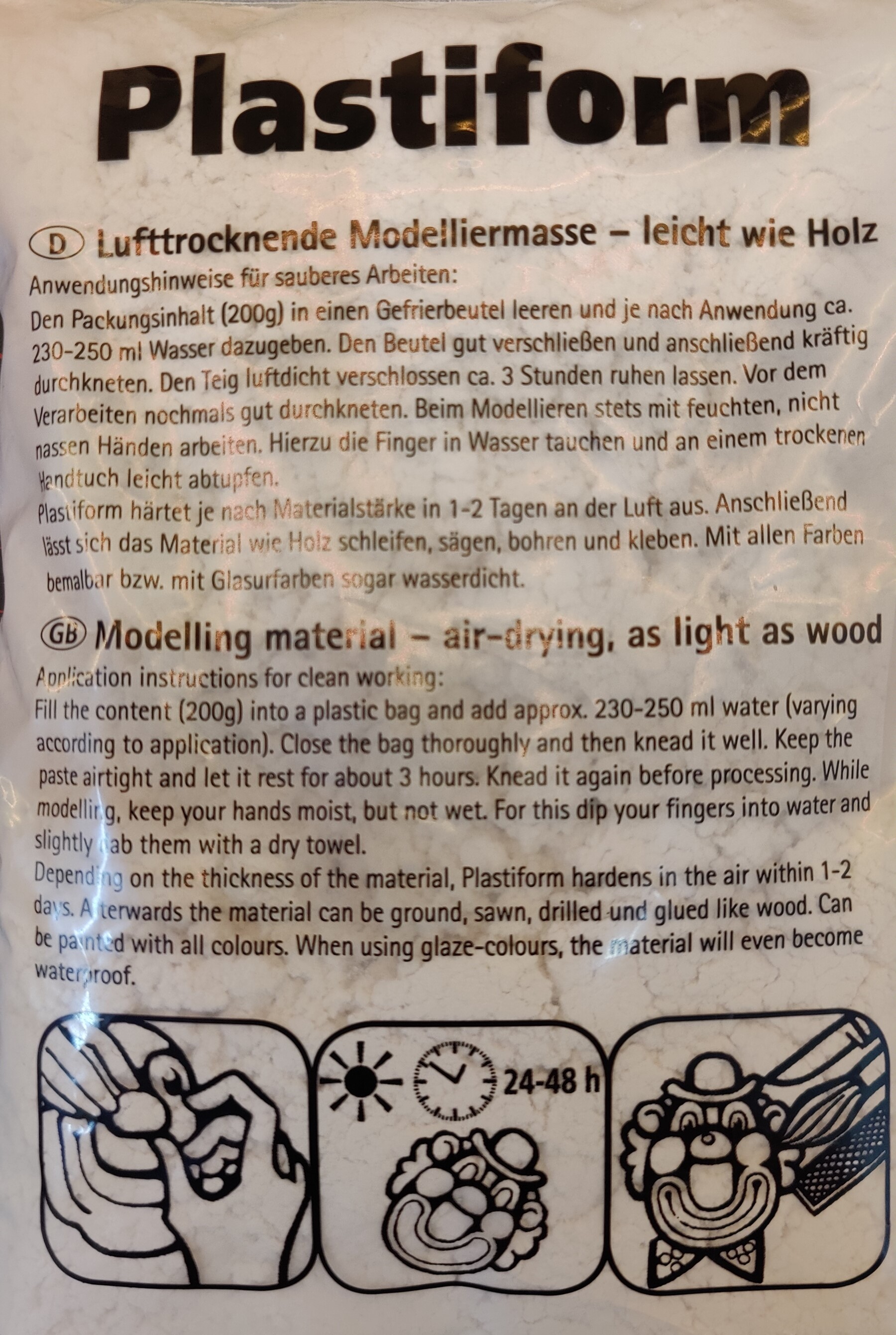 Eine Anleitung zur Verwendung der Modelliermasse ist auf der Verpackung abgebildet.
