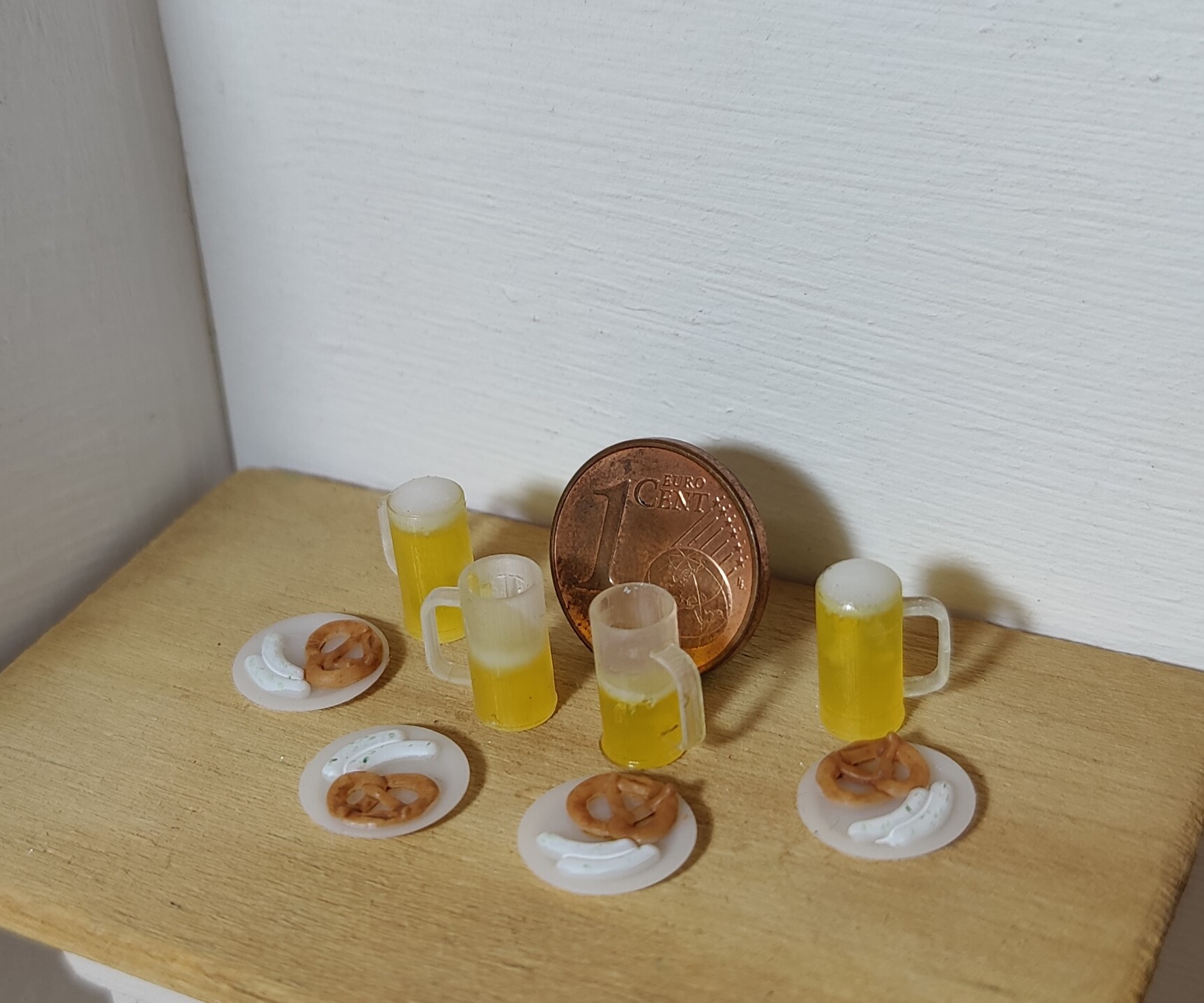 Das Set besteht aus 4 Tellern (Dm. ca. 1 cm) mit jeweils 2 Weißwürsten und einer Brezel, 2 gefüllten Biergläsern und 2 halbvollen Biergläsern.
